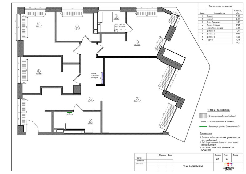 | План полов с указанием площадей и схемы переноса радиаторов |