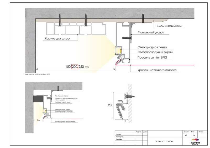 | Необходимые разрезы и узлы по сложным участкам потолка |