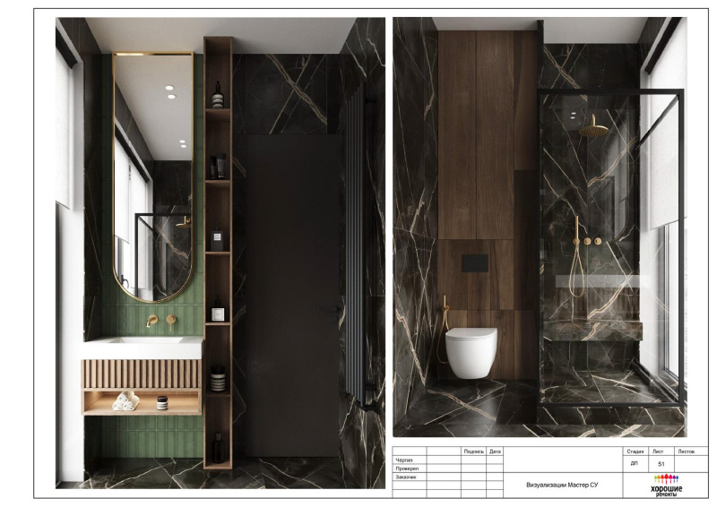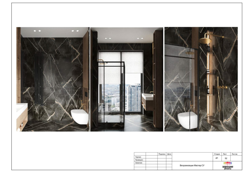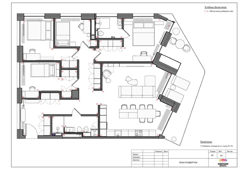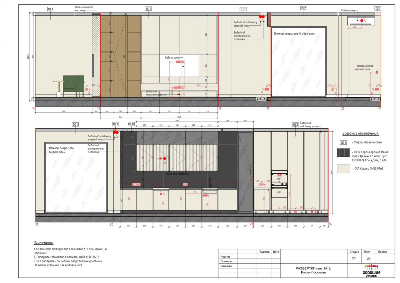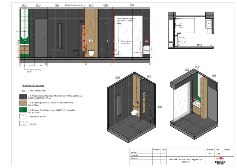 | Развертки стен с указанием типа отделочных материалов |