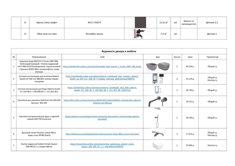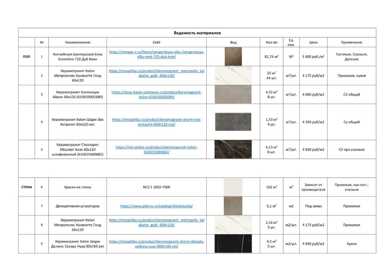 | Ведомость отделочных материалов (включая расчет кол-ва лепнины, обоев, плинтусов, площади стен) |