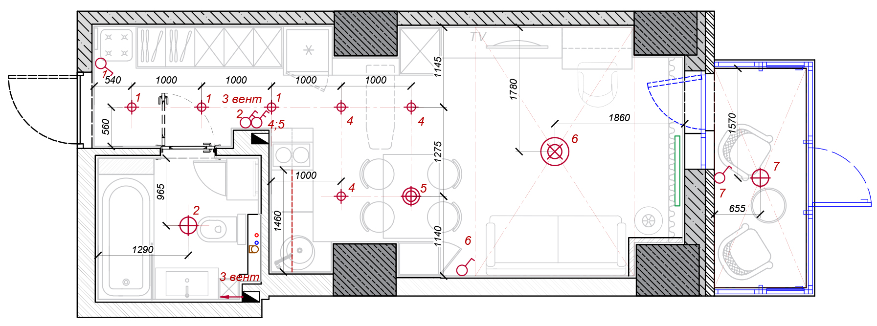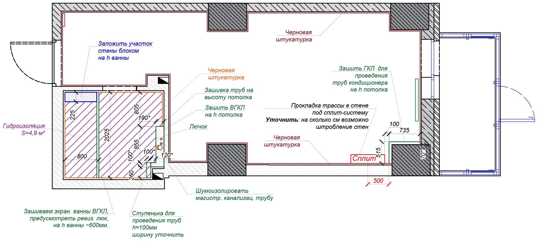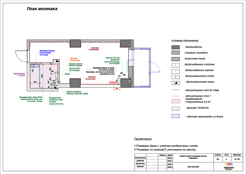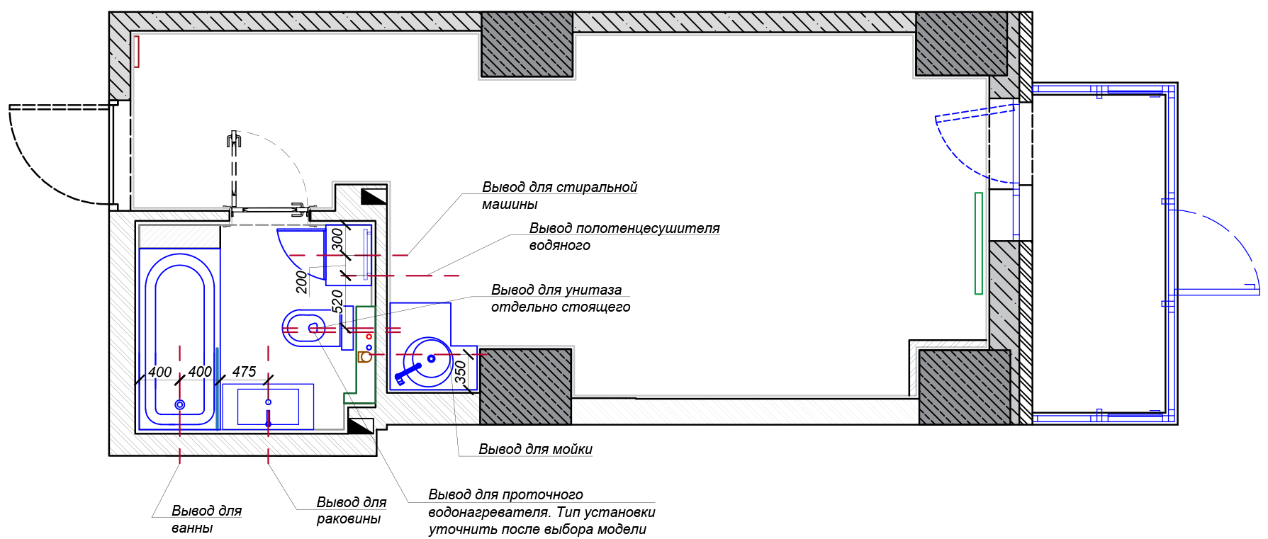 Вам предложат лучшее решение по расстановке стиральной машины, ванной, умывальника. Также этот план необходим для черновой разводки сантехники.