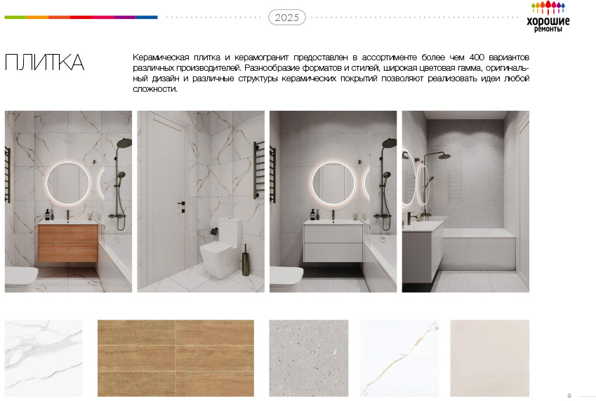 Материалы: Керамическая плитка или керамогранит (стоимость до 1200 руб / м2). Общее количество плитки не должно превышать 25% площади объекта.